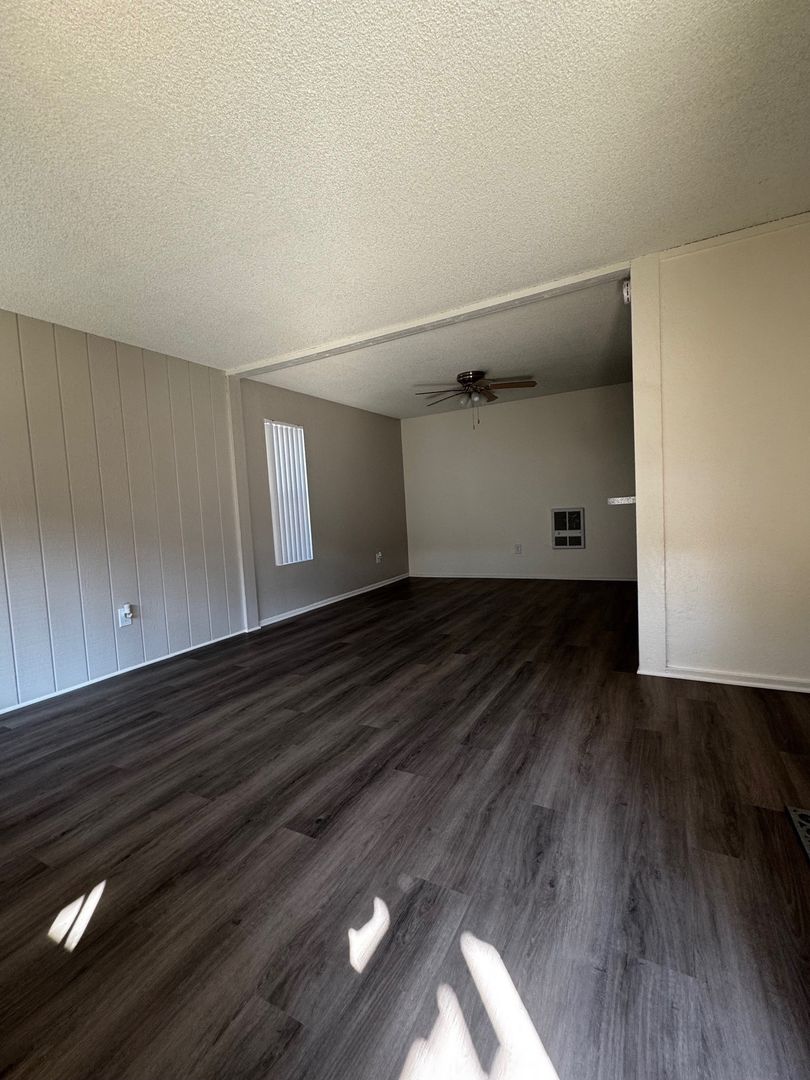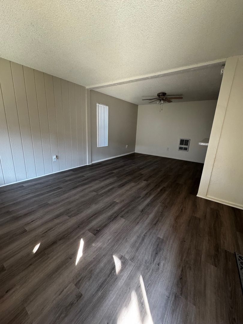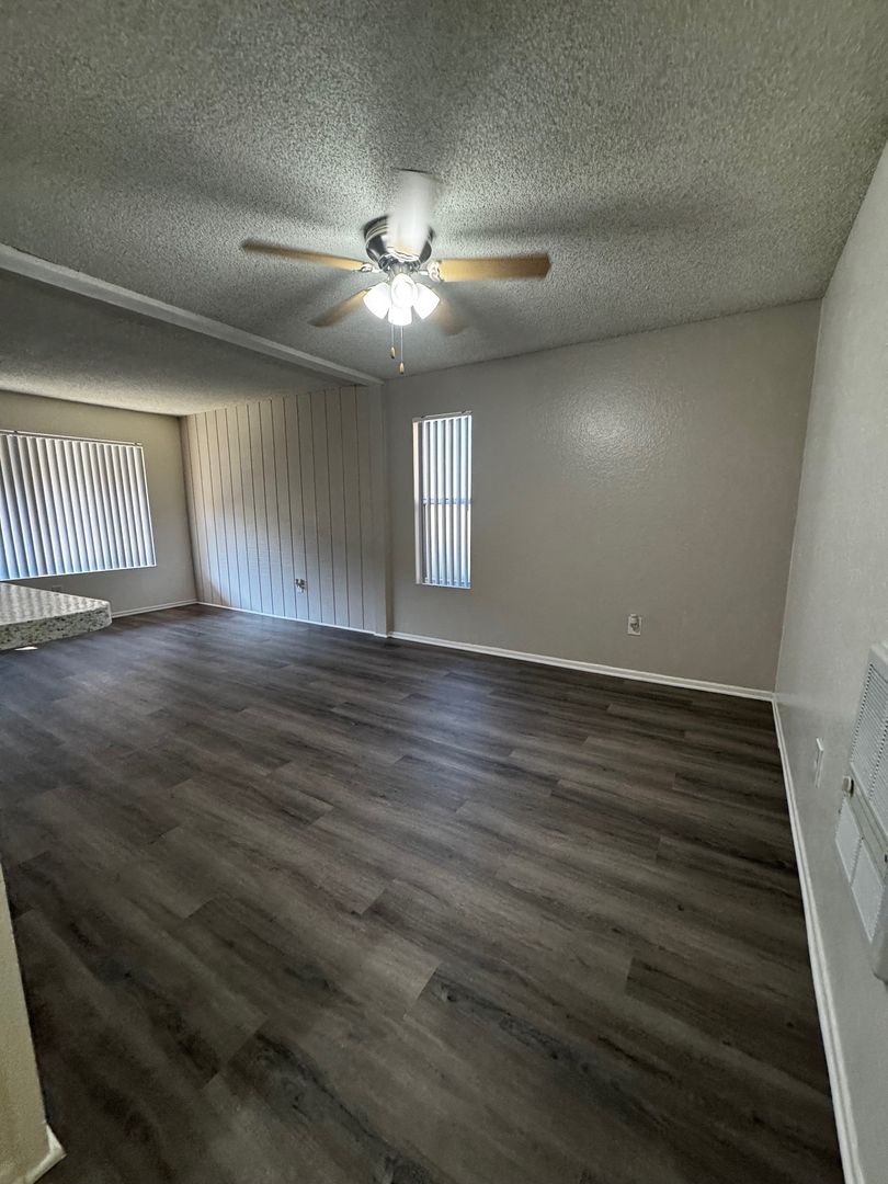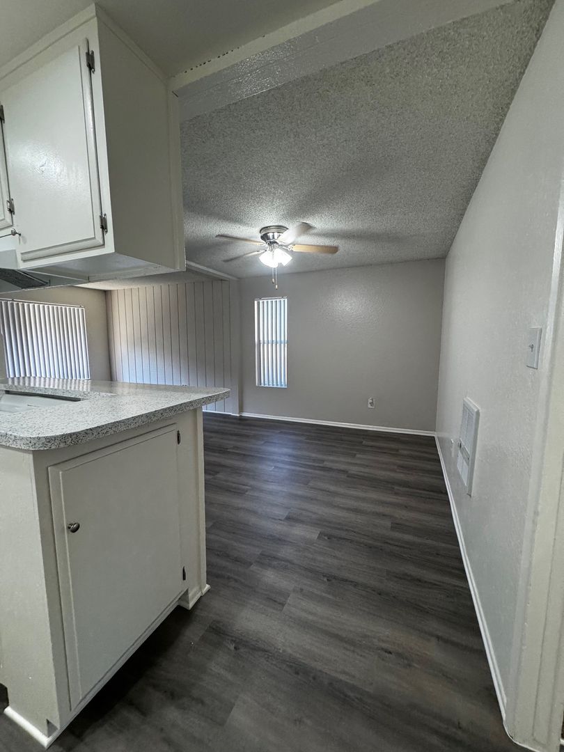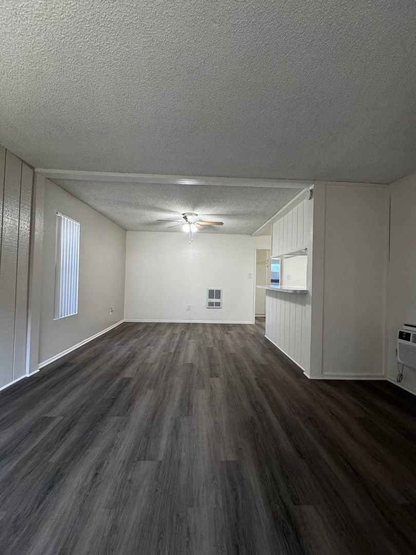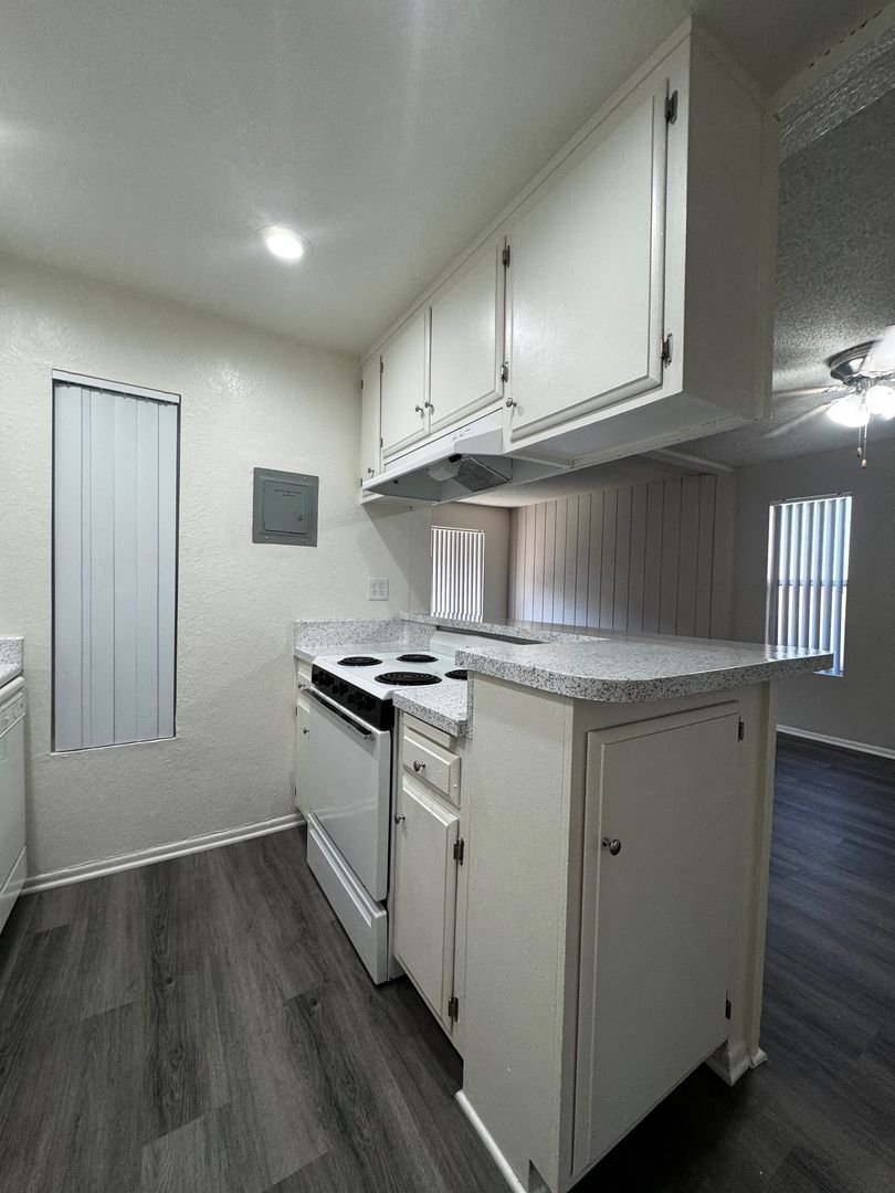 Spacious Downstairs One Bedroom One Bath-665 sq ft. It features new hard wood/vinyl flooring throughout. Carpet and ceiling fan in the bedroom, and vinyl dual pane glass windows. Includes 1 assigned carport with storage.