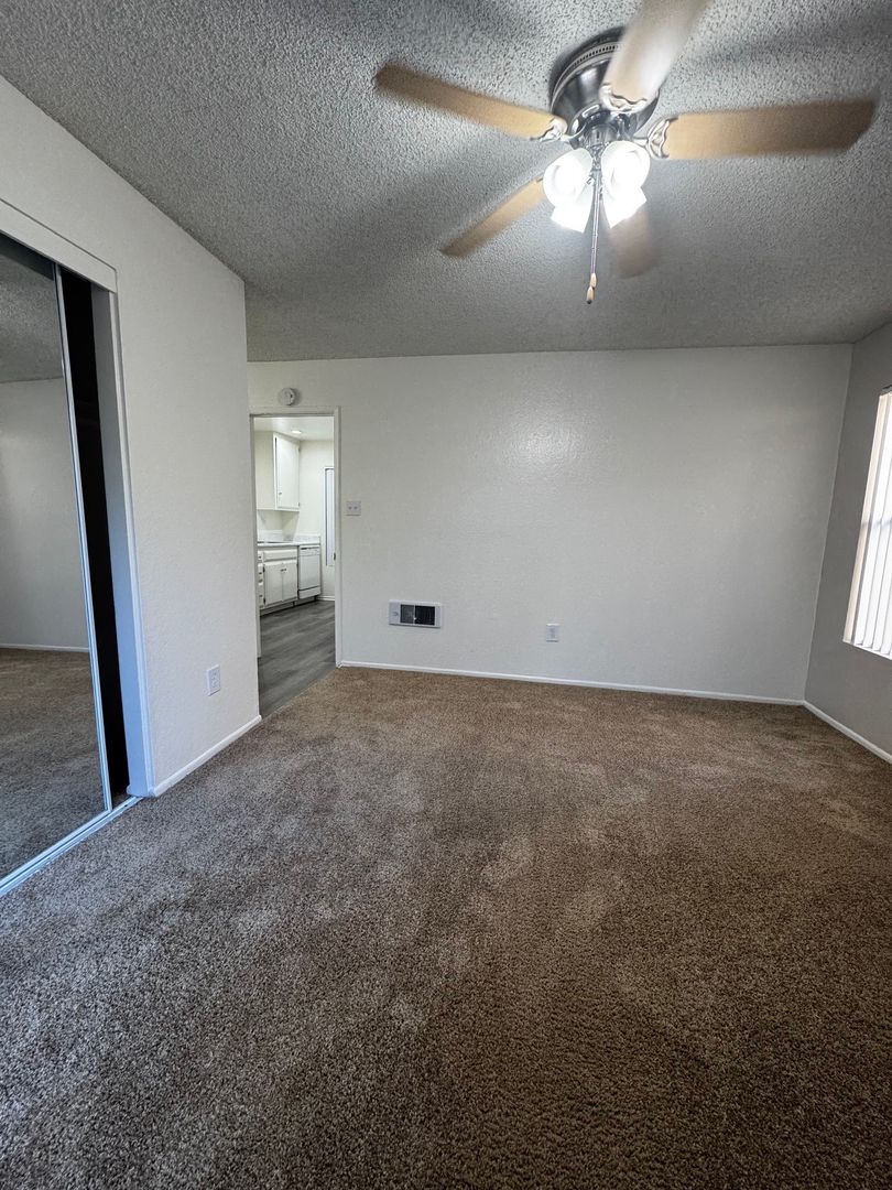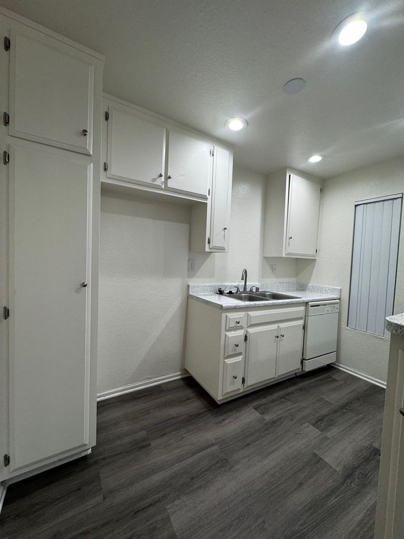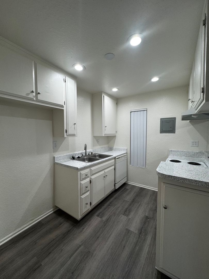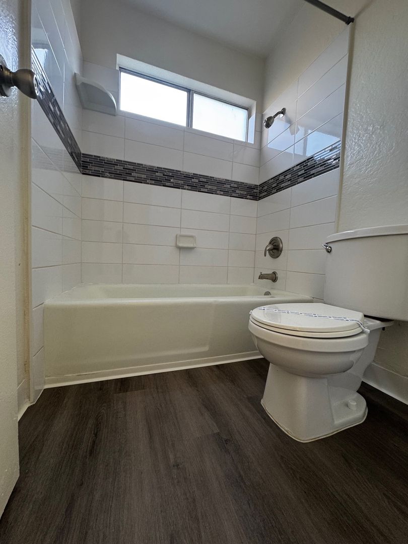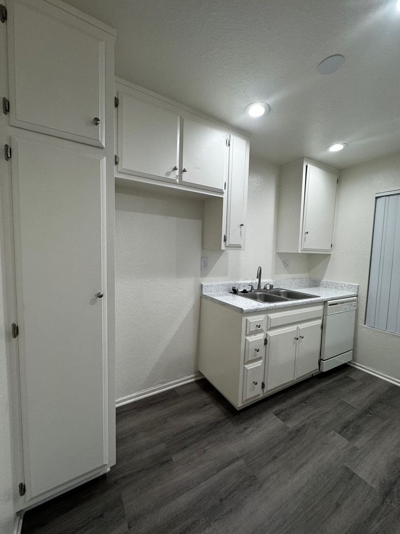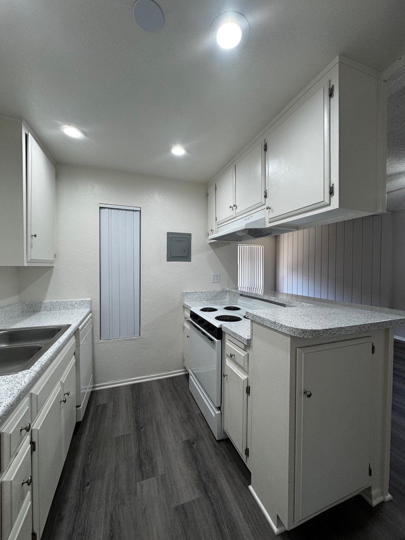 Spacious Downstairs One Bedroom One Bath-665 sq ft. It features new hard wood/vinyl flooring throughout. Carpet and ceiling fan in the bedroom, and vinyl dual pane glass windows. Includes 1 assigned carport with storage.