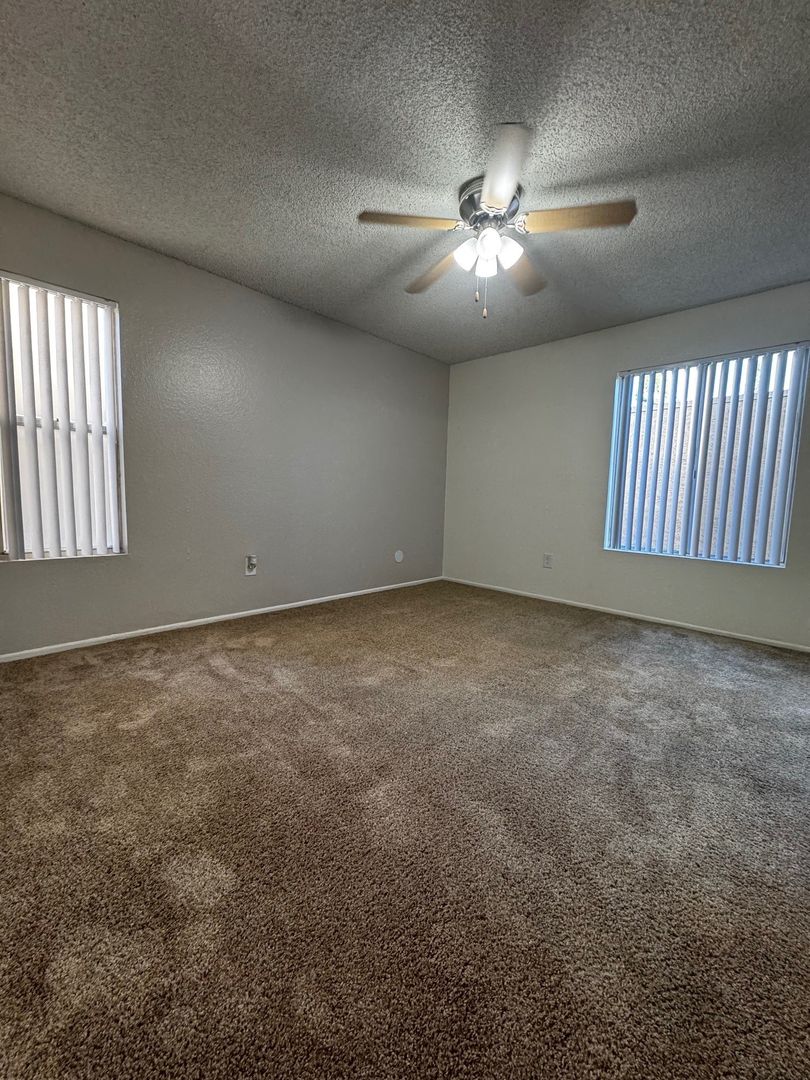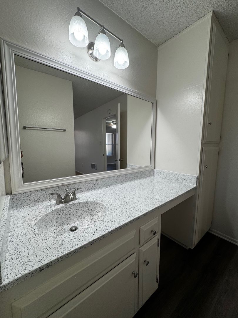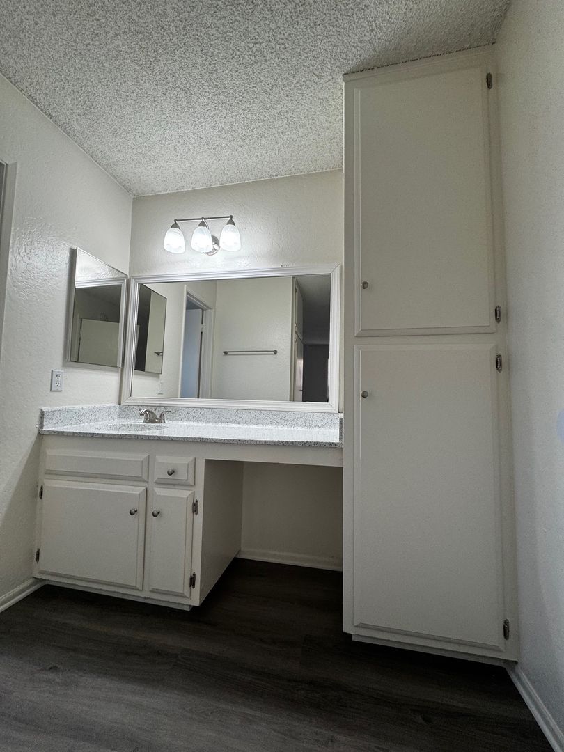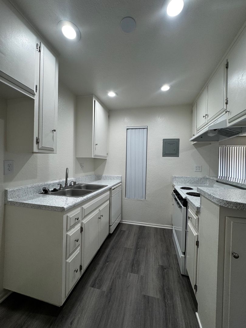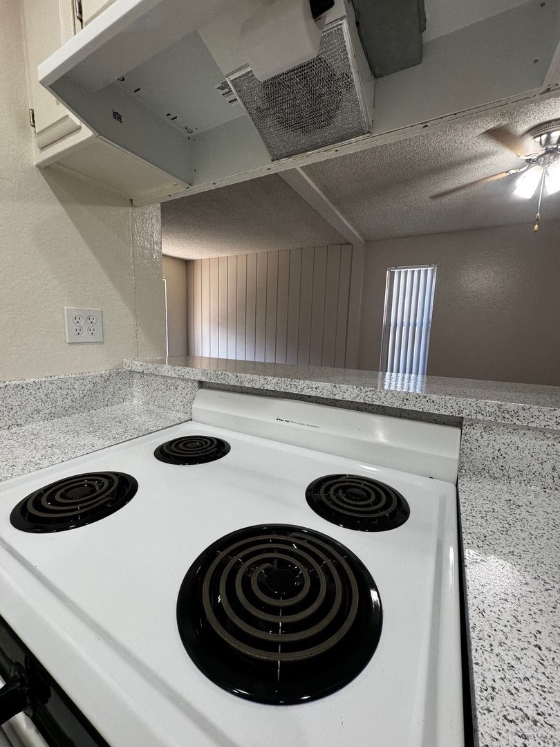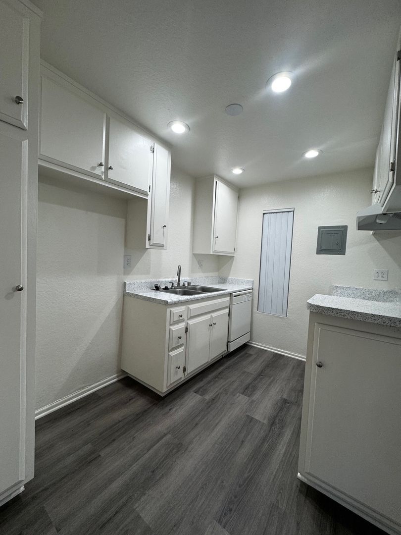 Spacious Downstairs One Bedroom One Bath-665 sq ft. It features new hard wood/vinyl flooring throughout. Carpet and ceiling fan in the bedroom, and vinyl dual pane glass windows. Includes 1 assigned carport with storage.