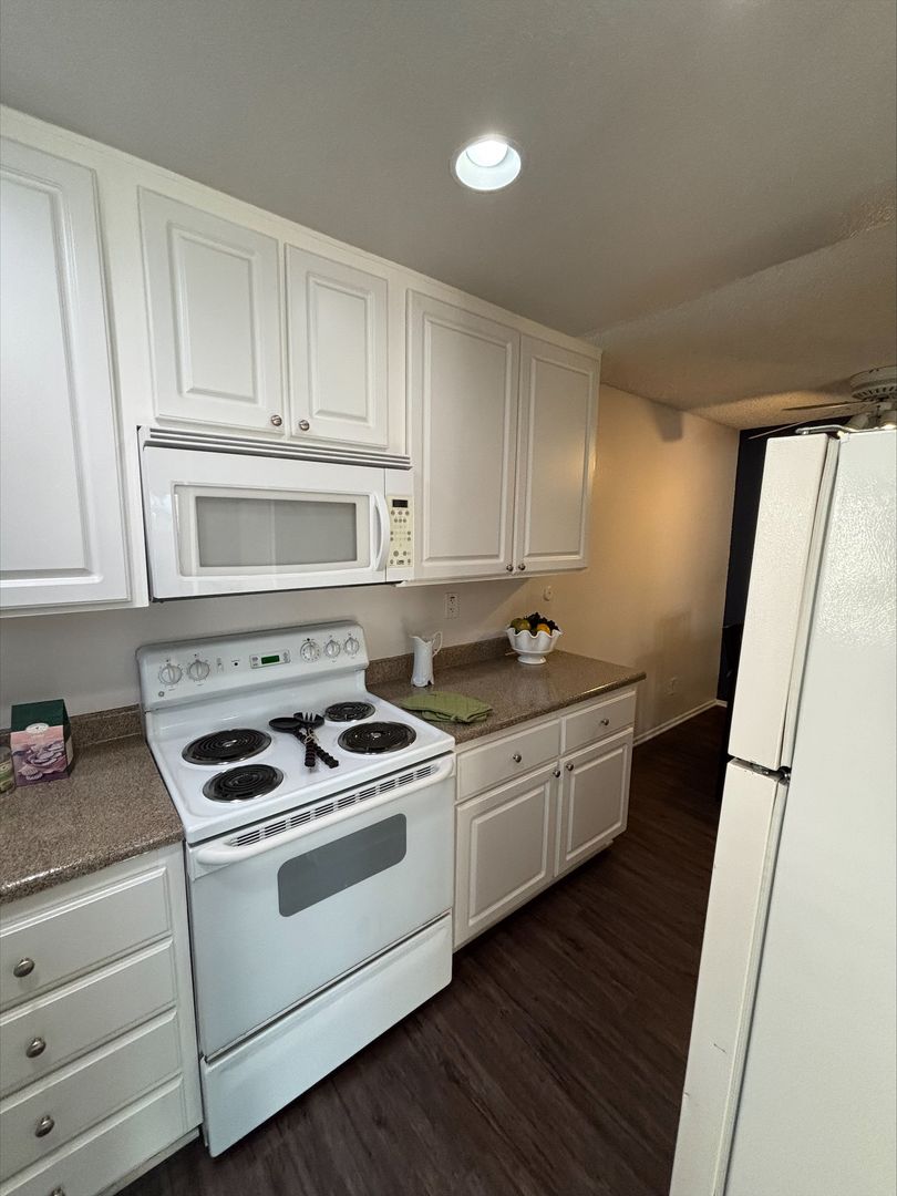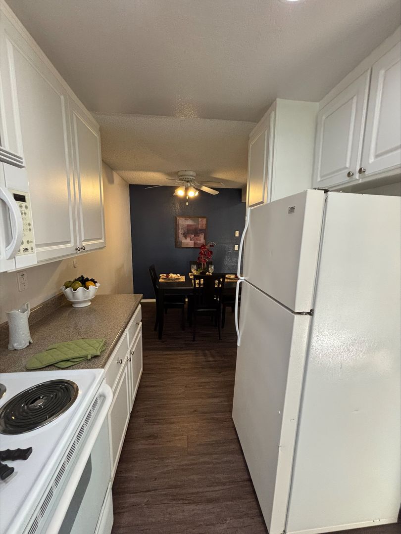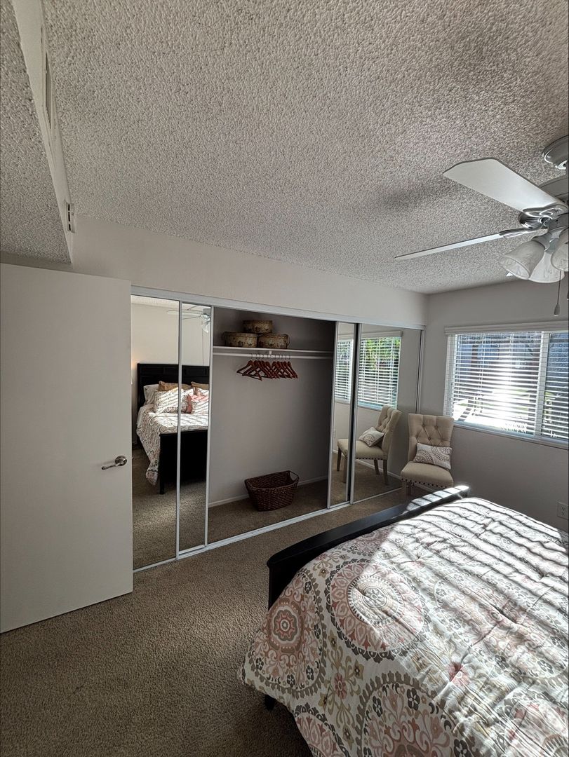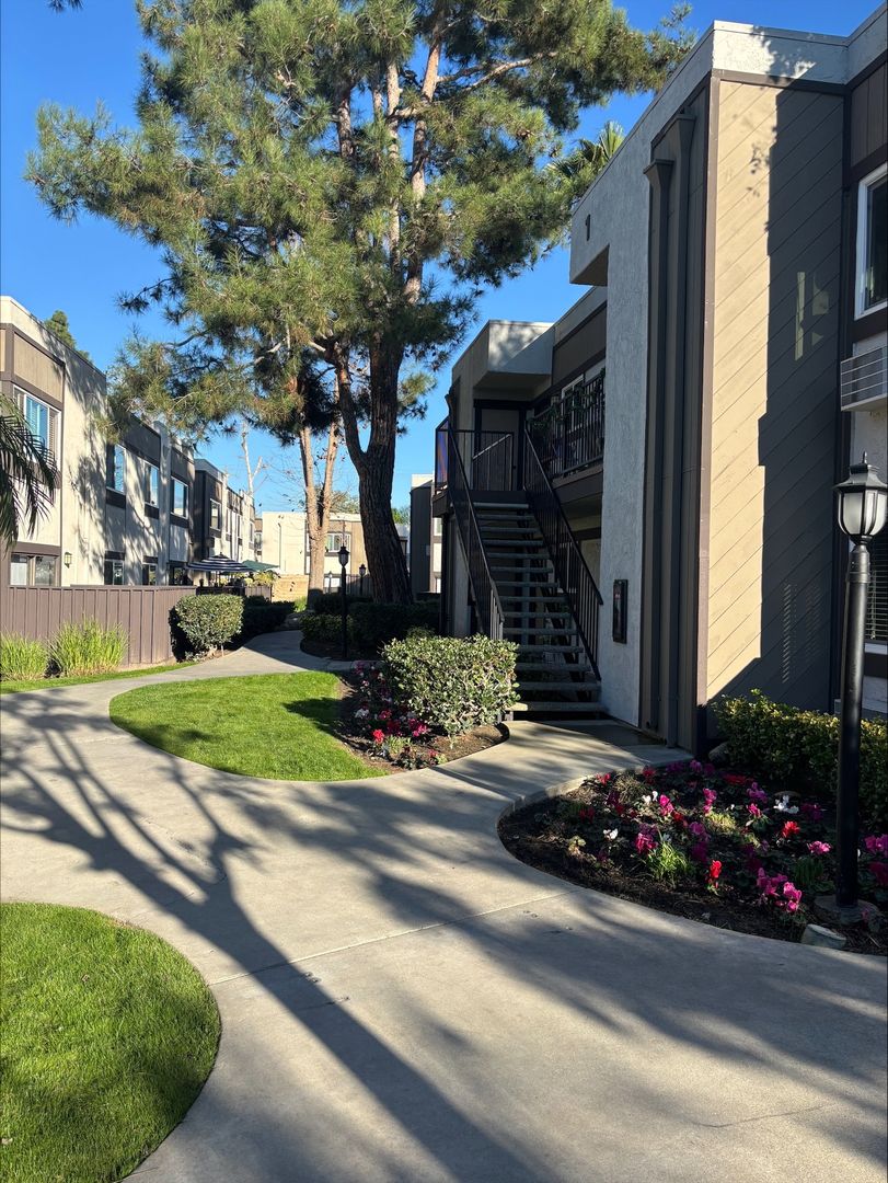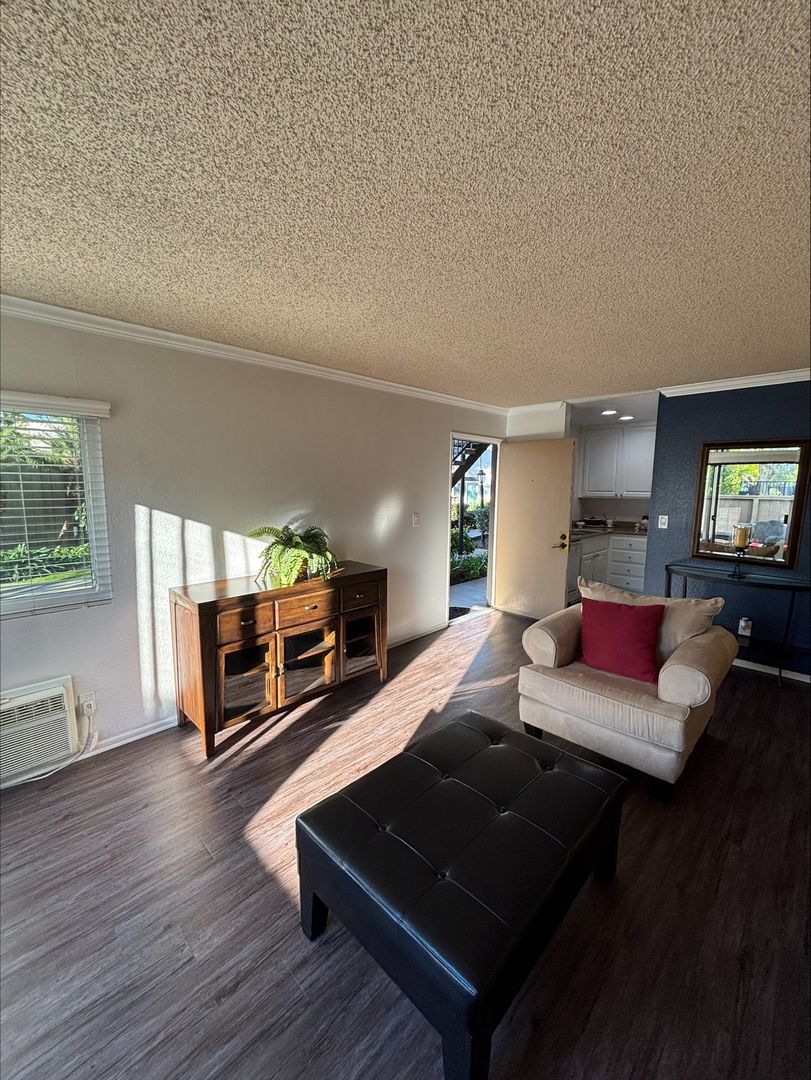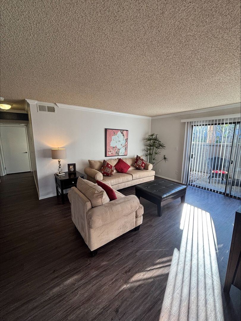 Welcome to your new home in Buena Park, CA! This spacious upstairs one-bedroom apartment offers a host of amenities designed for your comfort and convenience. The unit features an in-unit washer and dryer, central heating, and a wall unit AC to ensure your comfort throughout the year. The bedroom is carpeted and comes with a ceiling fan and mirrored closet doors, while the rest of the apartment boasts vinyl plank flooring. The kitchen is equipped with an electric stove, dishwasher, built-in microwave, and features recessed lighting for a modern touch. The living room is adorned with crown molding, a large window that lets in plenty of natural light that highlights, and our updated interior color with accent walls adds a touch of elegance to this already stunning apartment