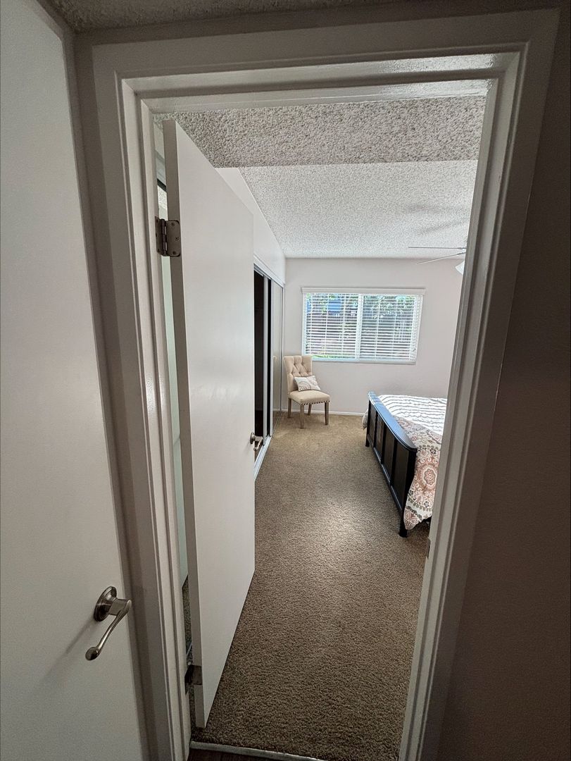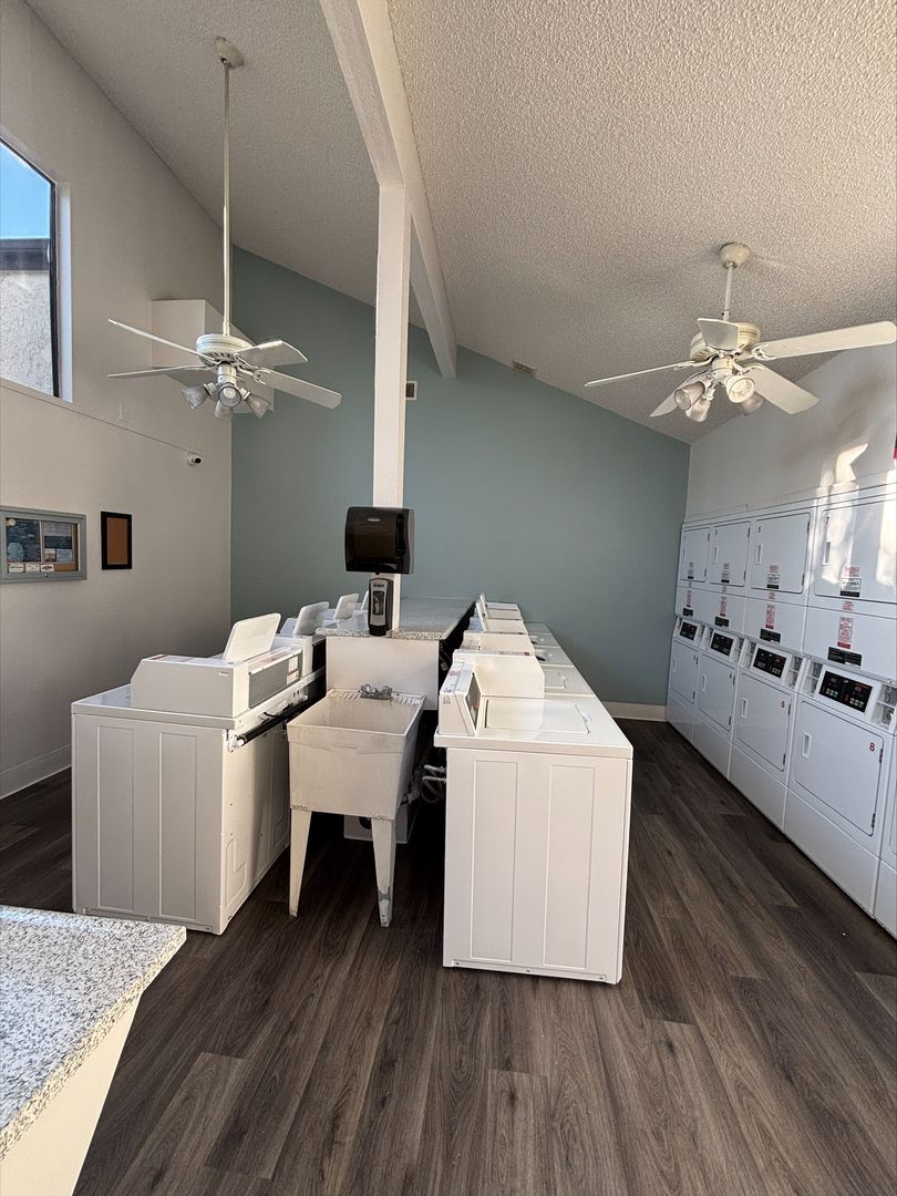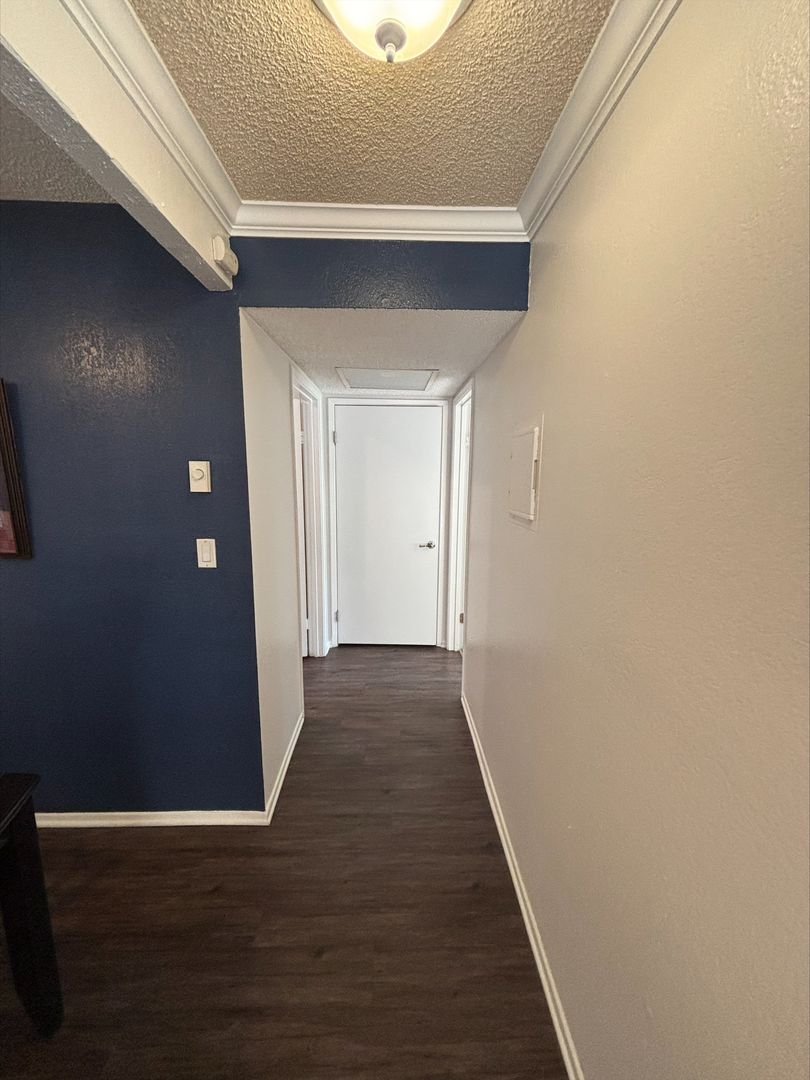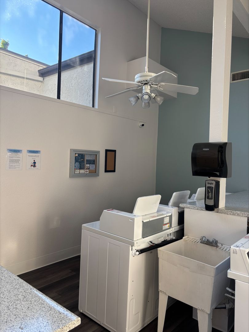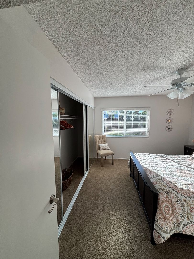 Welcome to your new home in Buena Park, CA! This spacious upstairs one-bedroom apartment offers a host of amenities designed for your comfort and convenience. The unit features an in-unit washer and dryer, central heating, and a wall unit AC to ensure your comfort throughout the year. The bedroom is carpeted and comes with a ceiling fan and mirrored closet doors, while the rest of the apartment boasts vinyl plank flooring. The kitchen is equipped with an electric stove, dishwasher, built-in microwave, and features recessed lighting for a modern touch. The living room is adorned with crown molding, a large window that lets in plenty of natural light that highlights, and our updated interior color with accent walls adds a touch of elegance to this already stunning apartment