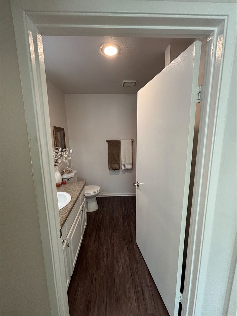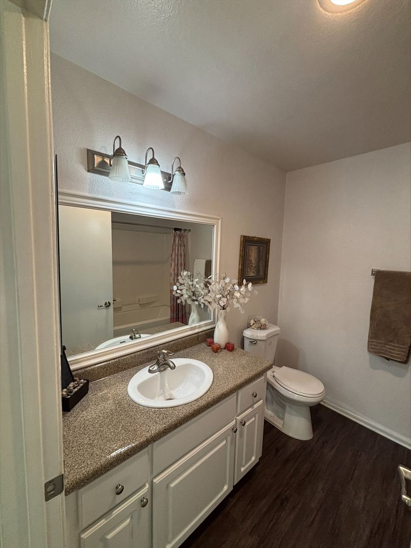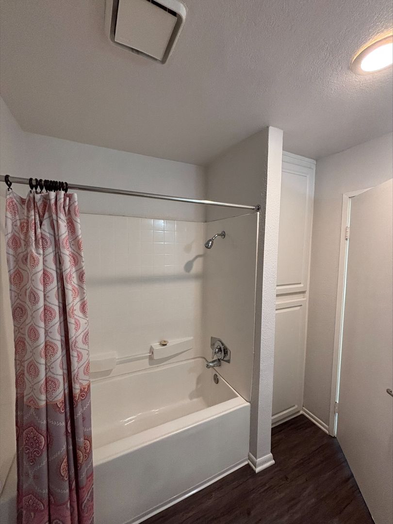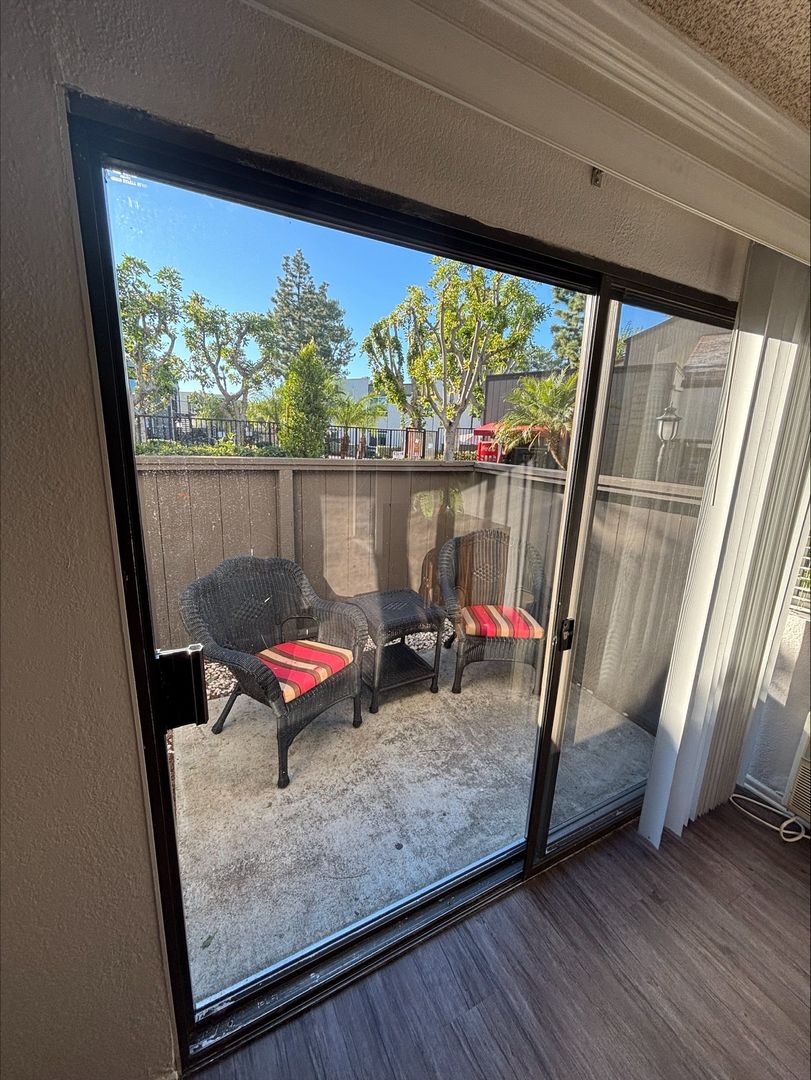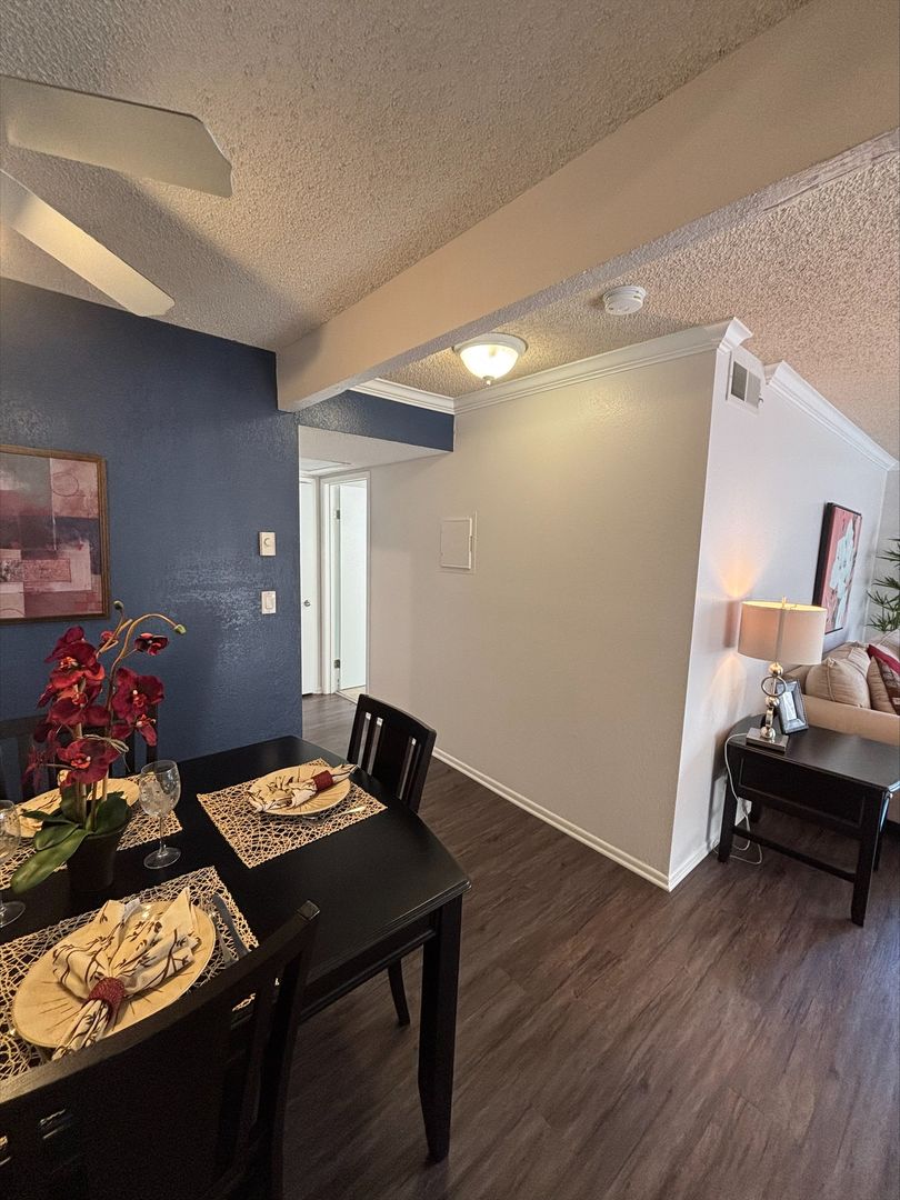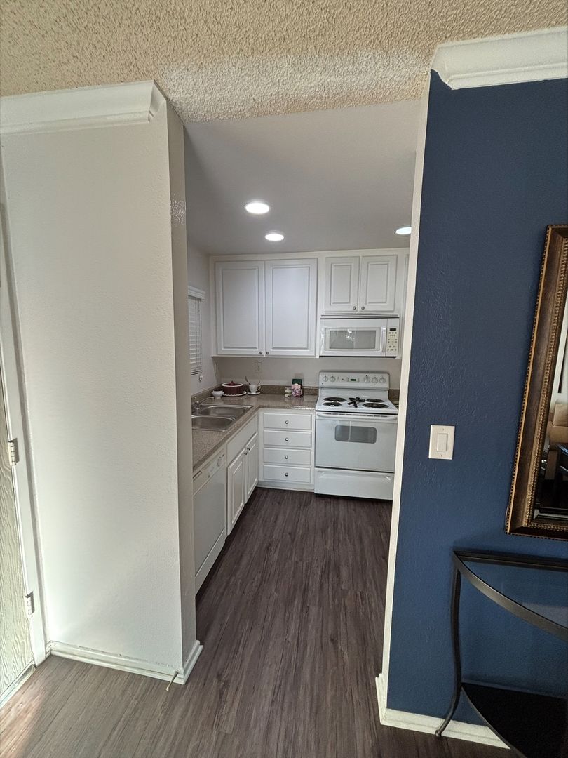 Welcome to your new home in Buena Park, CA! This spacious upstairs one-bedroom apartment offers a host of amenities designed for your comfort and convenience. The unit features an in-unit washer and dryer, central heating, and a wall unit AC to ensure your comfort throughout the year. The bedroom is carpeted and comes with a ceiling fan and mirrored closet doors, while the rest of the apartment boasts vinyl plank flooring. The kitchen is equipped with an electric stove, dishwasher, built-in microwave, and features recessed lighting for a modern touch. The living room is adorned with crown molding, a large window that lets in plenty of natural light that highlights, and our updated interior color with accent walls adds a touch of elegance to this already stunning apartment